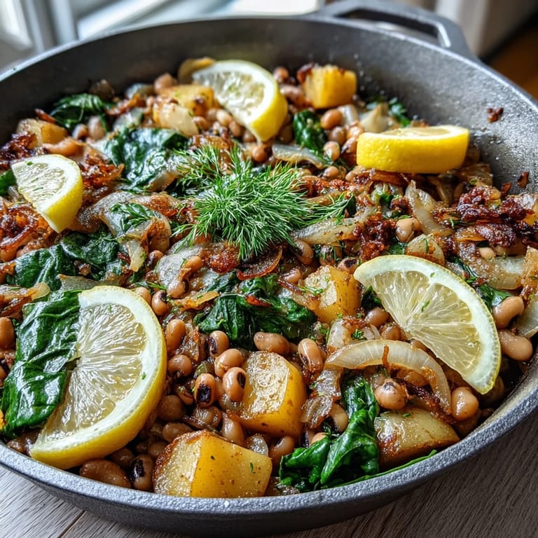 Save Cast iron skillets have a way of making you feel like you're cooking something important, even when you're just throwing together whatever's in the pantry. One Tuesday evening, I had spinach that needed using, a can of black-eyed peas I'd been meaning to cook with, and potatoes sitting on the counter looking hopeful. What emerged from that skillet was so satisfying and complete that I've made it dozens of times since, each version slightly different but always somehow exactly right.