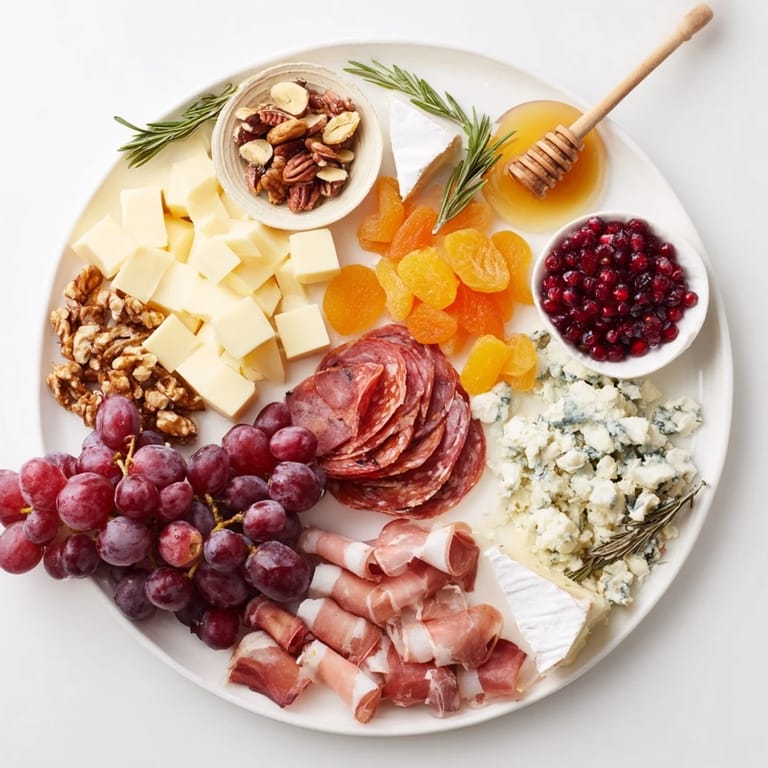 - Festive Extras: 1/3 cup cranberry sauce or red fruit chutney, 1/3 cup honey (with honey dipper), 1/2 cup marinated olives, 1/4 cup cornichons or mini gherkins, Seasonal fresh herbs (such as rosemary sprigs for garnish)
