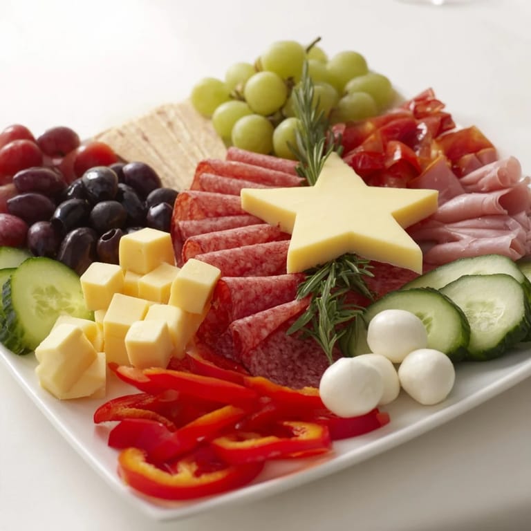 Use star-shaped cheese slices for the tree topper and garnish with fresh rosemary and red bell pepper strips for festive color.
