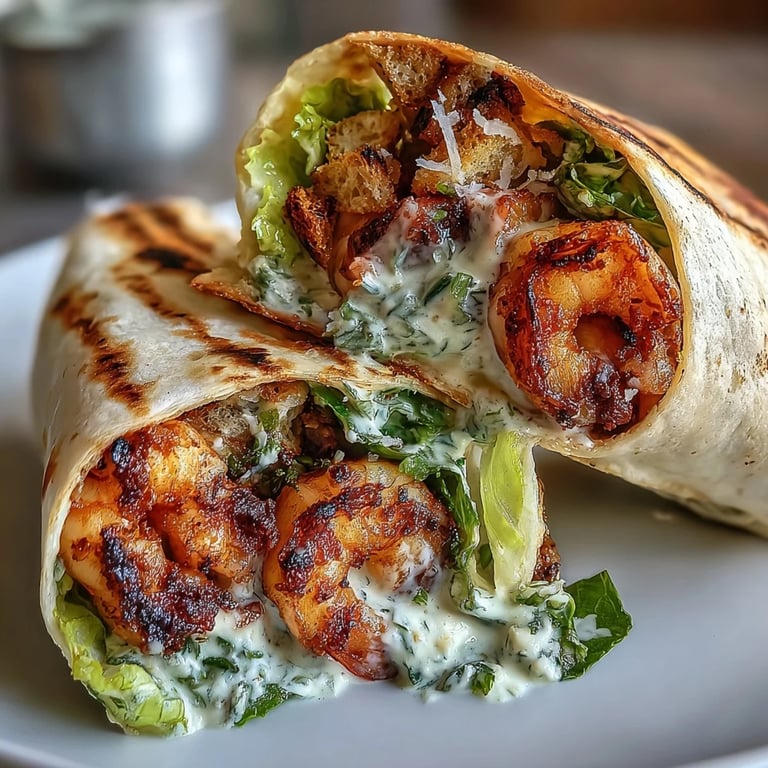 What makes this wrap feel complete instead of just assembled is the intentional contrast at every layer. You've got warm shrimp against cold lettuce, creamy dressing against crunchy croutons, sharp Parmesan against sweet tomato. When you roll it up and take that first bite, you're not eating one thing—you're experiencing four or five different flavors and textures happening at once, and that's what makes it satisfying enough to be a real meal.