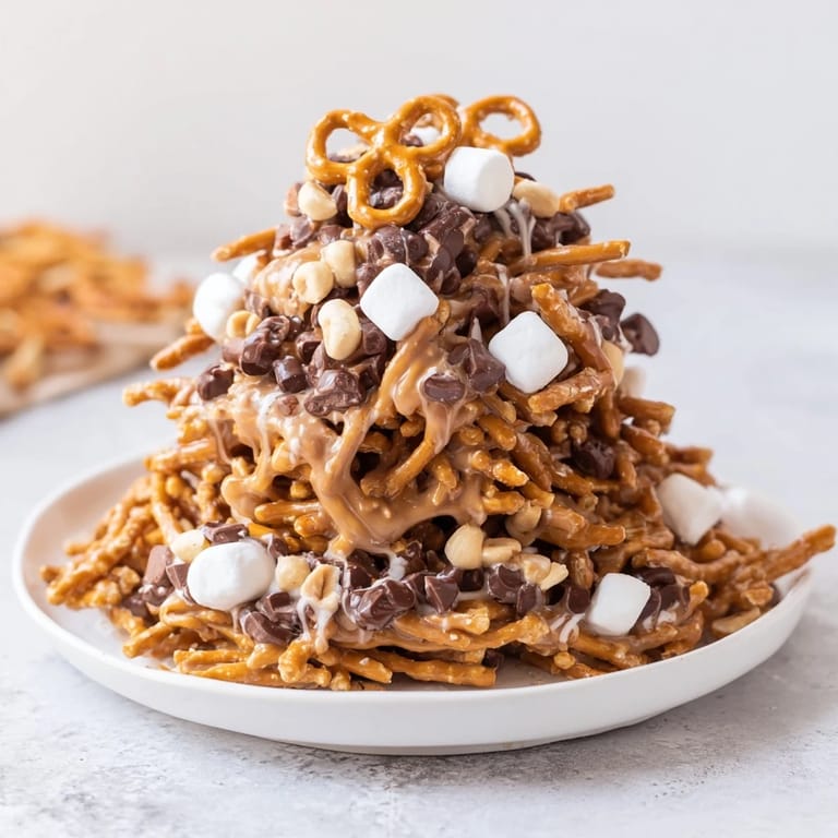 Save A whimsical and delicious tower of crunchy, sweet haystack candies layered and stacked for a fun, shareable treat.