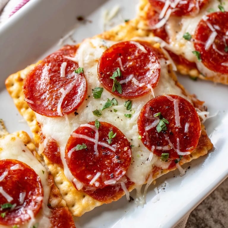 Save A quick and irresistible appetizer featuring zesty pepperoni slices layered on crisp square crackers, topped with melty cheese for the perfect snack or party bite.