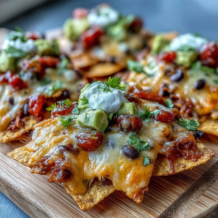 - Nacho Toppings: 1 cup (120 g) shredded cheddar cheese; 1 cup (120 g) shredded Monterey Jack cheese; 1 cup (240 g) canned black beans, rinsed and drained; 1 medium avocado, diced; ½ cup (120 g) sour cream or Greek yogurt; ½ cup (80 g) cherry tomatoes, quartered; ¼ cup pickled jalapeños, sliced; ¼ cup sliced black olives (optional); fresh cilantro leaves, for garnish
